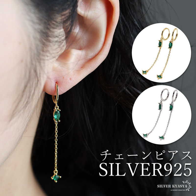 - (ゴールド) シルバー925 チェーンピアス ドロップピアス グリーン 18KGP 両耳2点セット レディース 金アレ対応