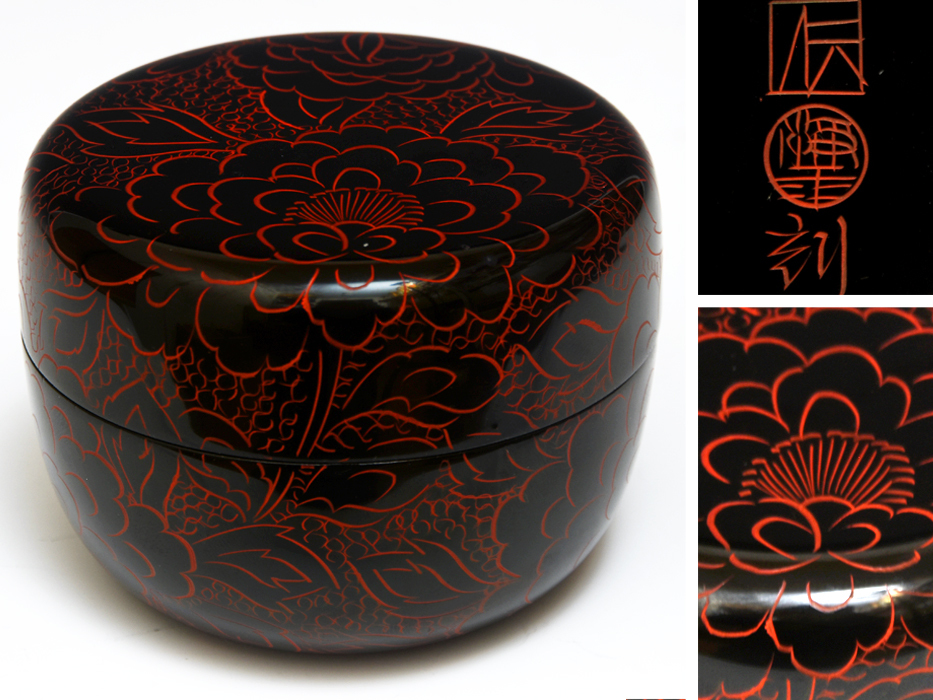 > 讃岐彫 蒟醤(きんま) 牡丹文平棗 在銘 茶道具 木工芸 漆工芸 漆芸 木製漆器 讃岐伝統工芸 香川県 u0009a