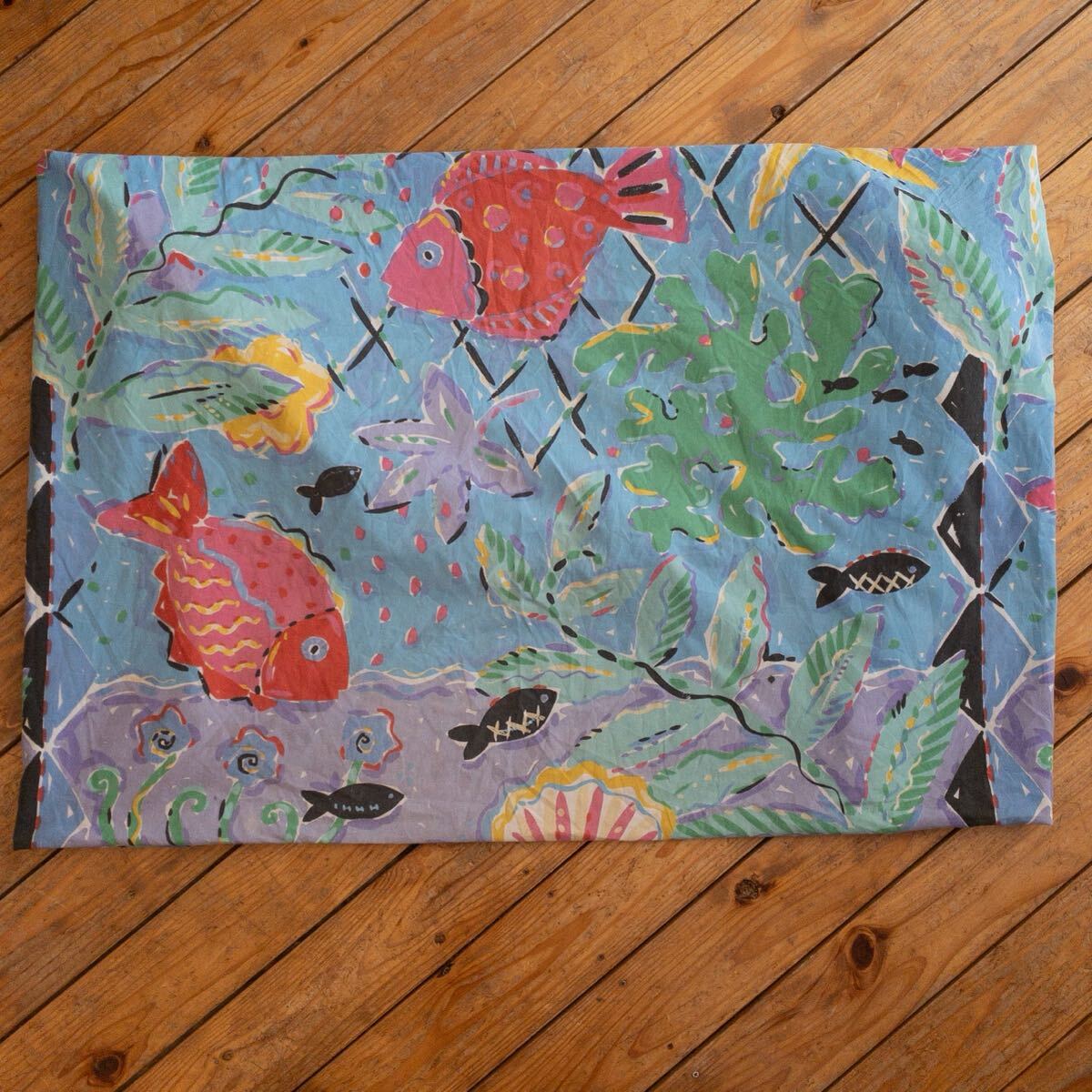 > USAヴィンテージ ベッドシーツ 魚柄 リメイク生地 素材 海 海藻 ボックスシーツ カラフル マルチカラー 層柄 アメリカ仕入 B2443