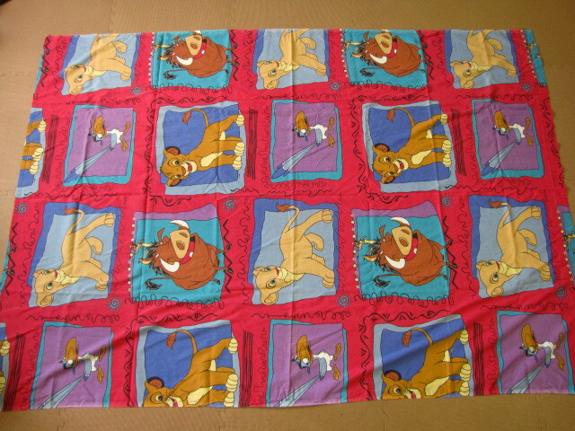 > F577*USAアメリカ仕入 総柄 164x232 ビンテージ フラットシーツ ライオンキング ディズニー リメイク生地 素材 大判 Disney 古着