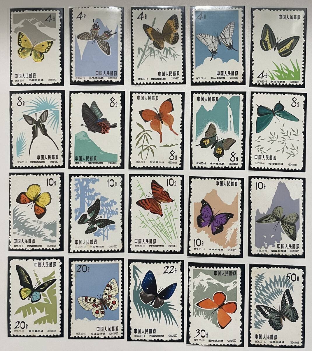 - 【中国切手 未使用希少】特56 中華人民郵政『蝶』切手全20種類完品