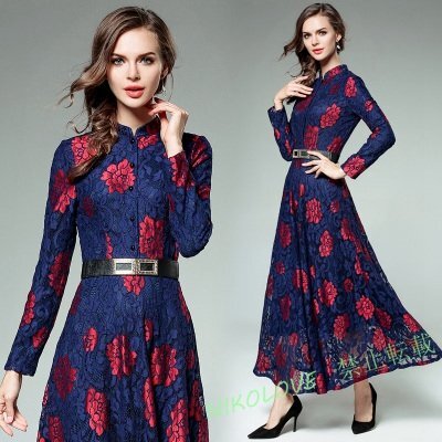 - 新品 パーティードレス レースワンピース フォーマル 総レース 花柄 マキシ丈 Aライン パーティー 発表会 入園式 入学式 長袖 ネイビー