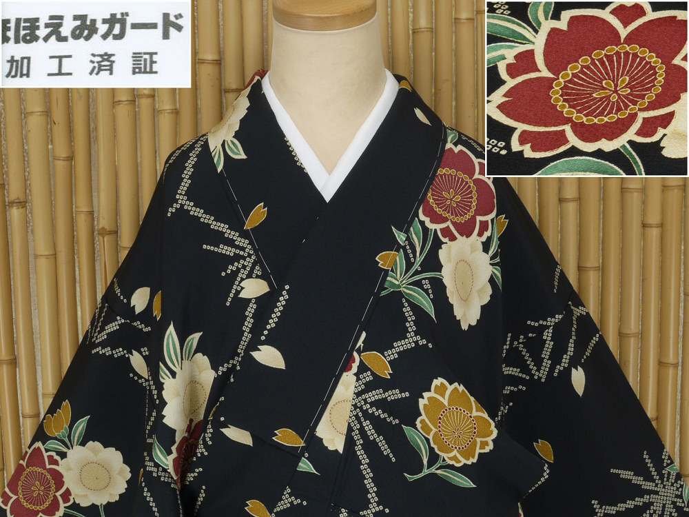 > 【京かんざし】t-696★小紋 黒地 胴抜き仕立て ほほえみガード 躾糸付未着用身丈156 cm裄丈63 cm★即決送料無料!