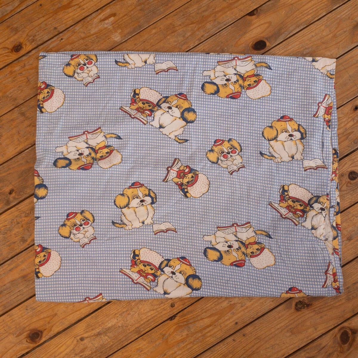 - USAヴィンテージ ベッドシーツ 少年 犬 リメイク生地 素材 ドッグ DOG ボーイ 総柄 イラスト フラットシーツ アメリカ仕入 B2479