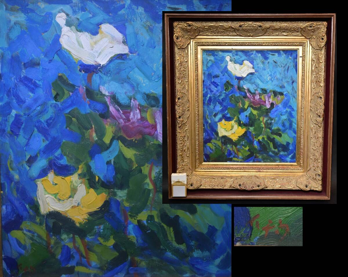 - 真贋保証■中畠一宇■ 油彩『菊』1970年作 F8号 サイン有 額装 鳥取県生 熊谷守一に師事 絵画 静物画 イタリア文化功労章受賞