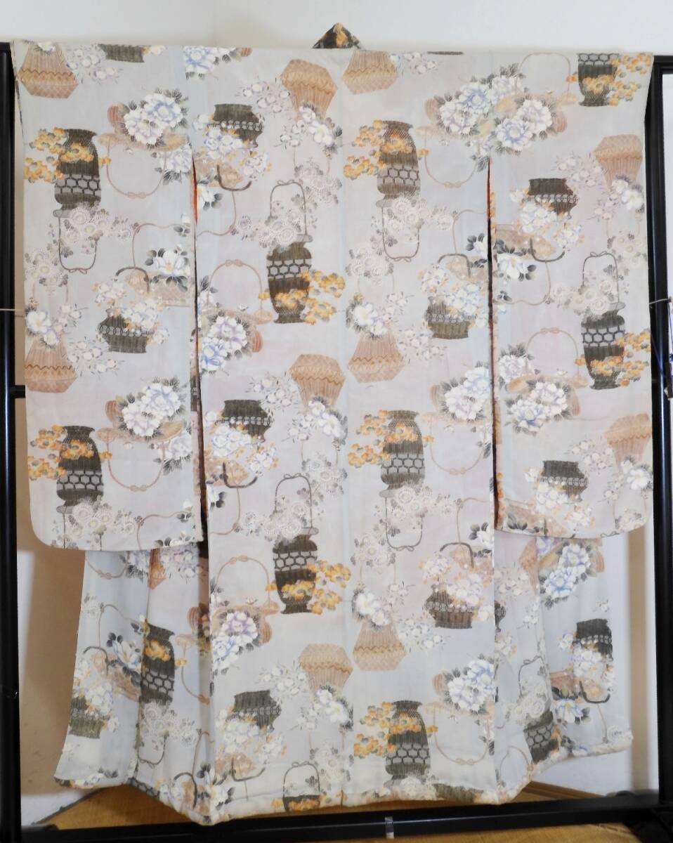 - <銀の斧>正絹・逸品・江戸縮緬お振袖衣裳・明治期衣裳・桜、紅葉、牡丹・美しい潤色・淡いグレー・江戸ちりめん