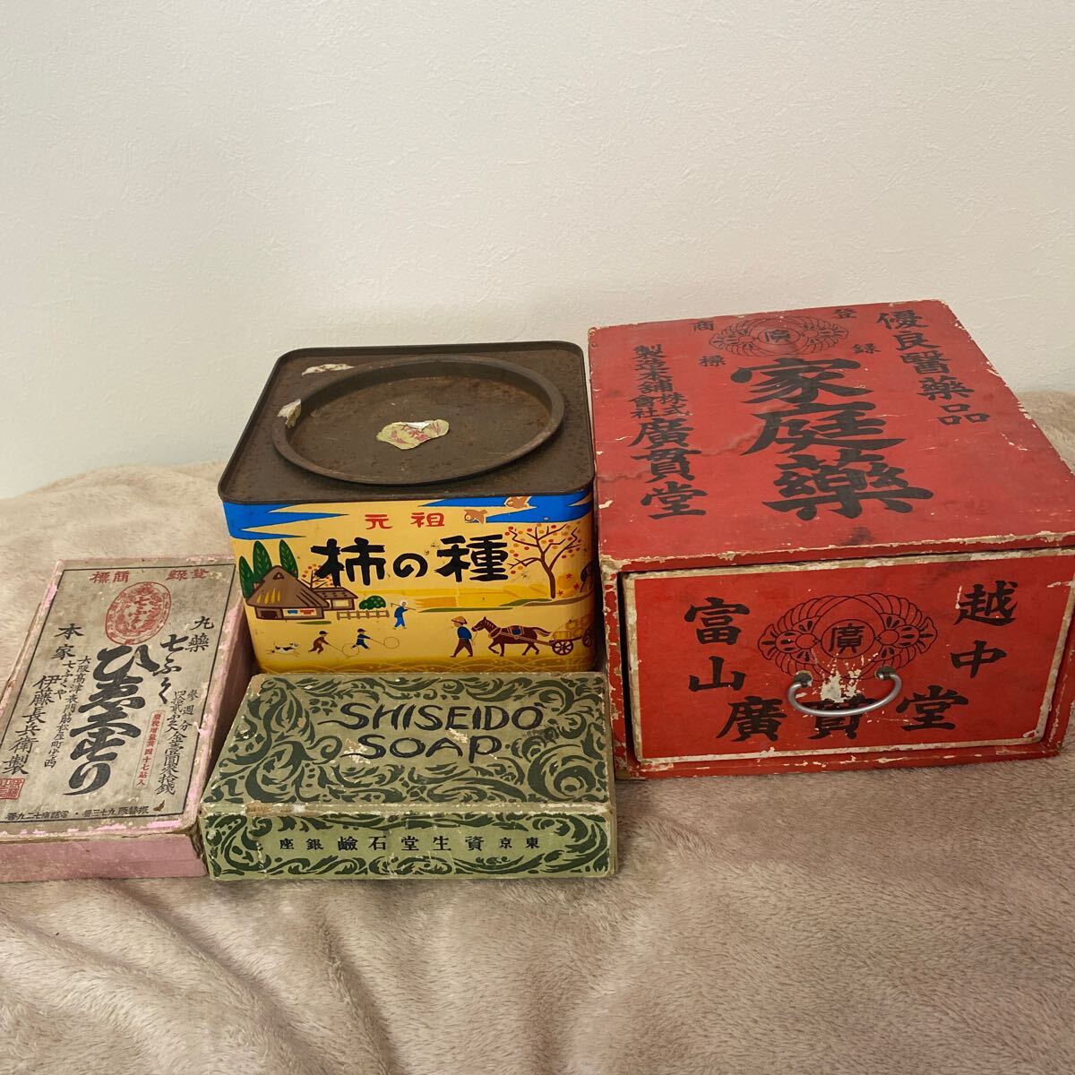 - 昭和レトロ 当時物 木箱 空箱 薬箱 置き薬 越中富山 柿の種 昭和 大正 明治 小物入れ コレクション コレクター