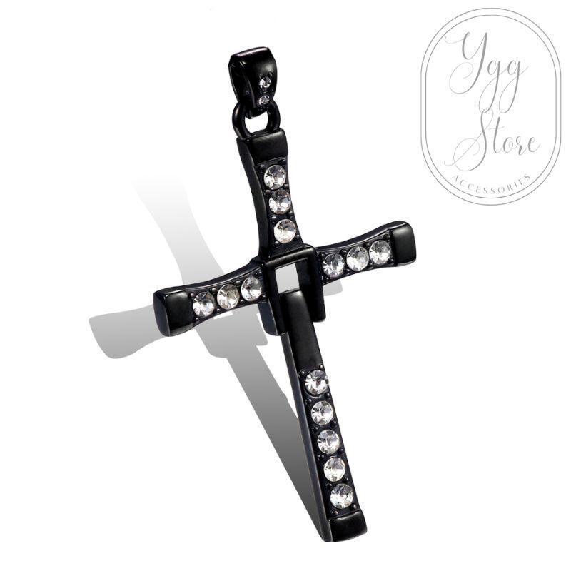 - YGG★ワイスピ クロス ネックレス 十字架 ラインストーン入り ブラック 黒 チェーン付き ワイルドスピード ドミニク 石入り メンズ 大