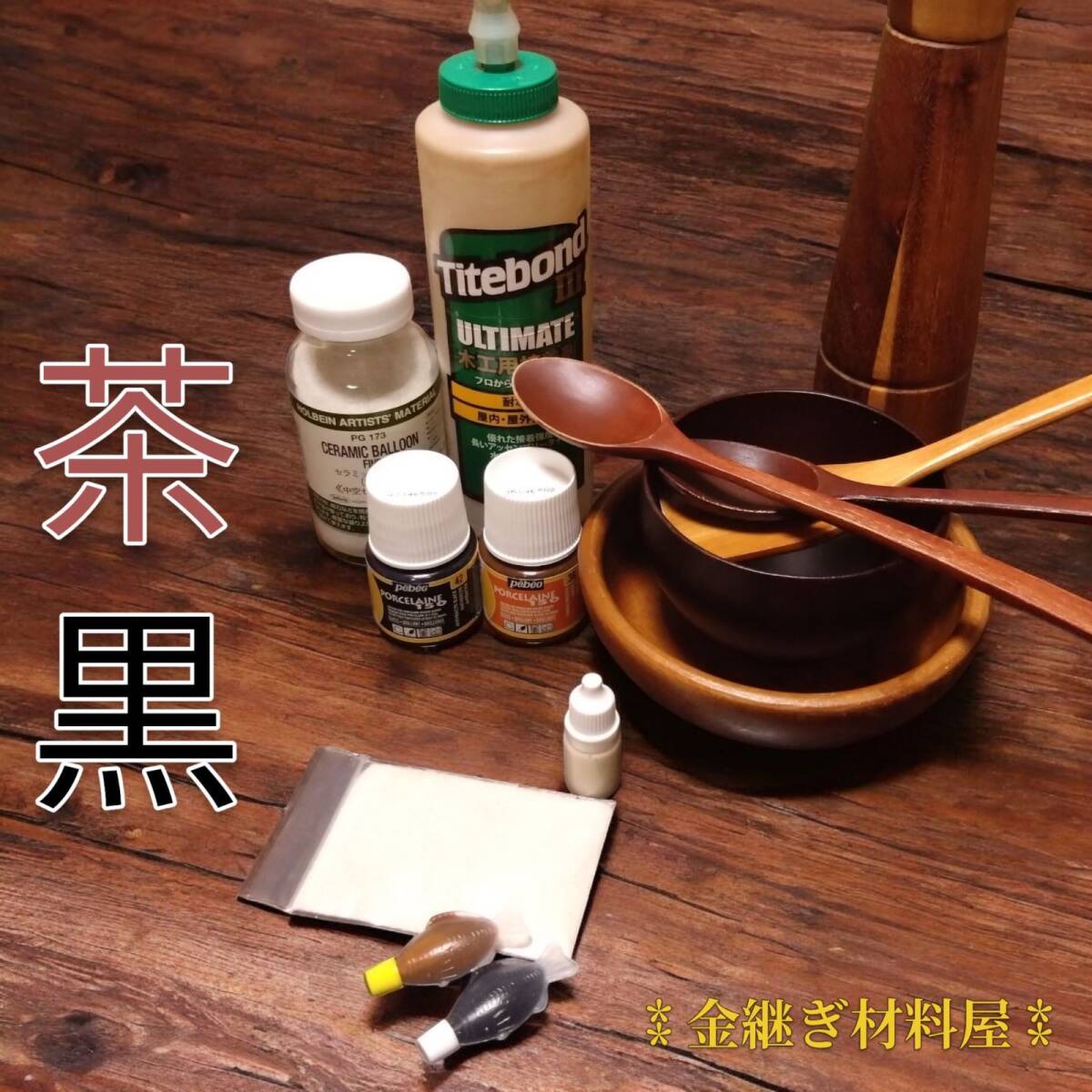 > 簡易金継ぎ 【小分け】これで解決4点セット 現代金継ぎ カトラリー 木製食器の補修 茶色と黒色 塗料 2色 金継ぎ 黒継ぎ 茶継ぎ
