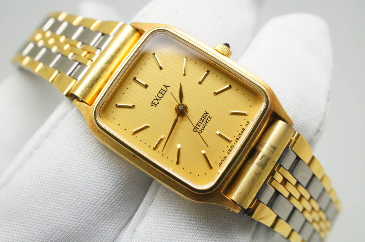 > D87●作動良好 超美品 CITIZEN シチズン EXCELA 2930-291921 金文字盤 レクタンギュラー型 レディース腕時計 コンビ お洒落 クォーツ