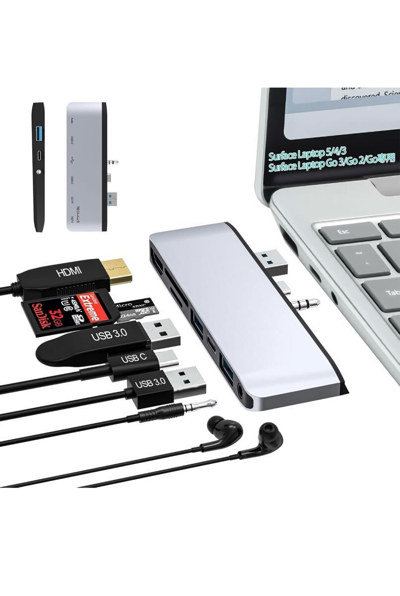 > Surface Laptop 5/4/3/Go/Go 2/7in3 ハブ- 4K@30Hz HDMI、2x USB 3.0、USB-C、SD TFカードスロット、3.5mmオーディオアダプタ