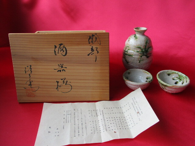 - 織部 玉山窯 玉置保夫 酒器揃 徳利・ぐい呑×2 3点セット 栞 共箱 未使用品