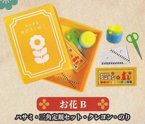 - お道具箱マスコット お花B ハサミ・三角定規セット・クレヨン・のり ミニチュア ガチャ カプセルトイ 未開封