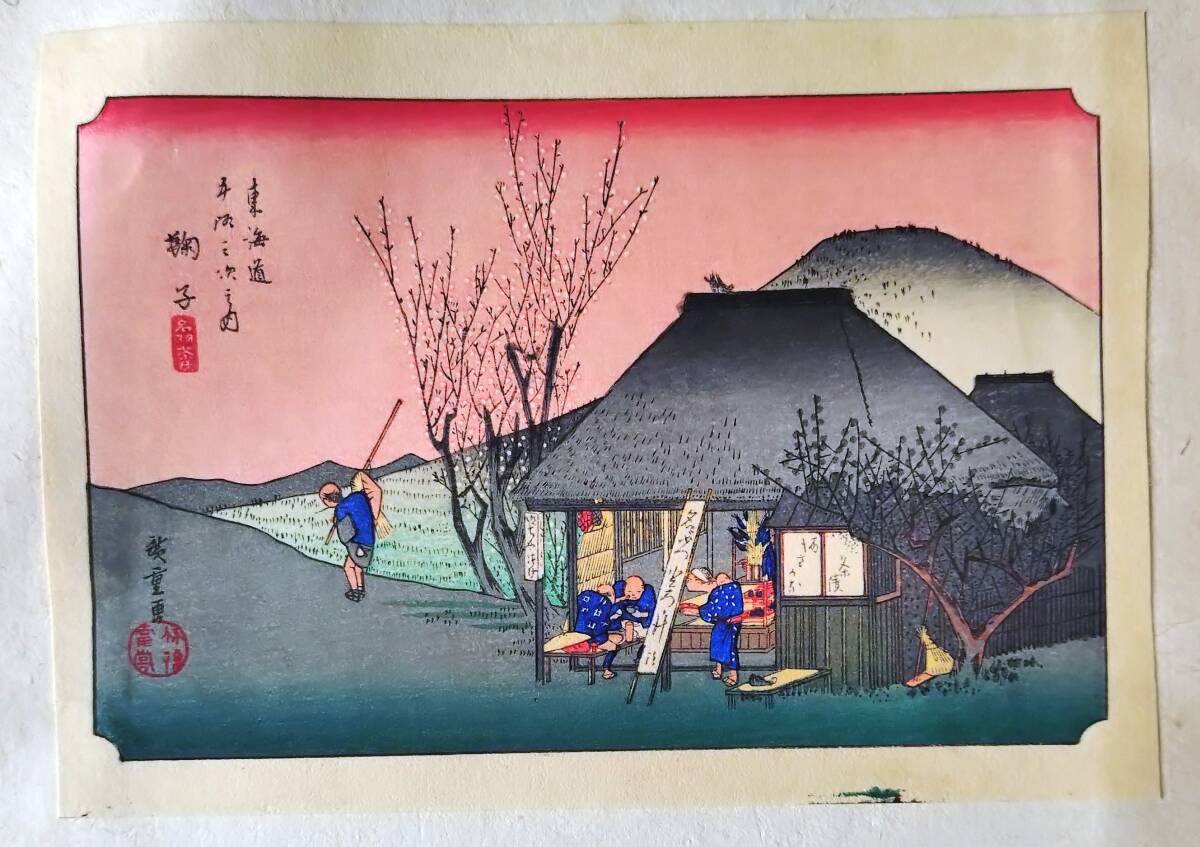 - f25042365〇彩色木版画 ハガキサイズ 広重 東海道中53次 鞠子 錦絵 浮世絵 昭和年代〇和本古書古文書