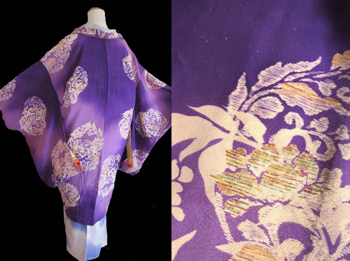 - 花唐草紋 紫ぼかし 錦紗 アンティーク長羽織 金粉ちらし 大正ロマン 刺繍