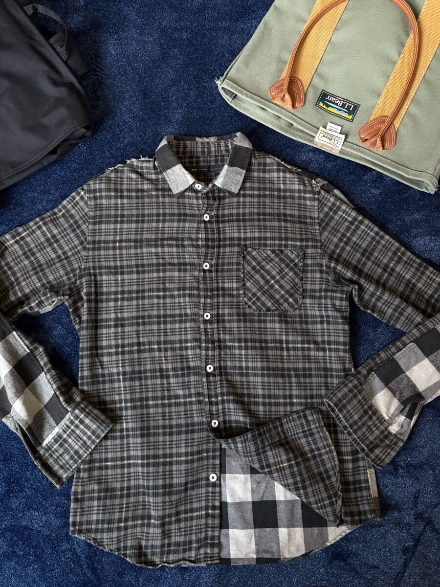 - 超美品 シップス SHIPS パッチワーク チェック切替デザイン ショートカラー(短襟) 高品質素材 長袖 ネルシャツ sizeM SHIPS JET BLUE