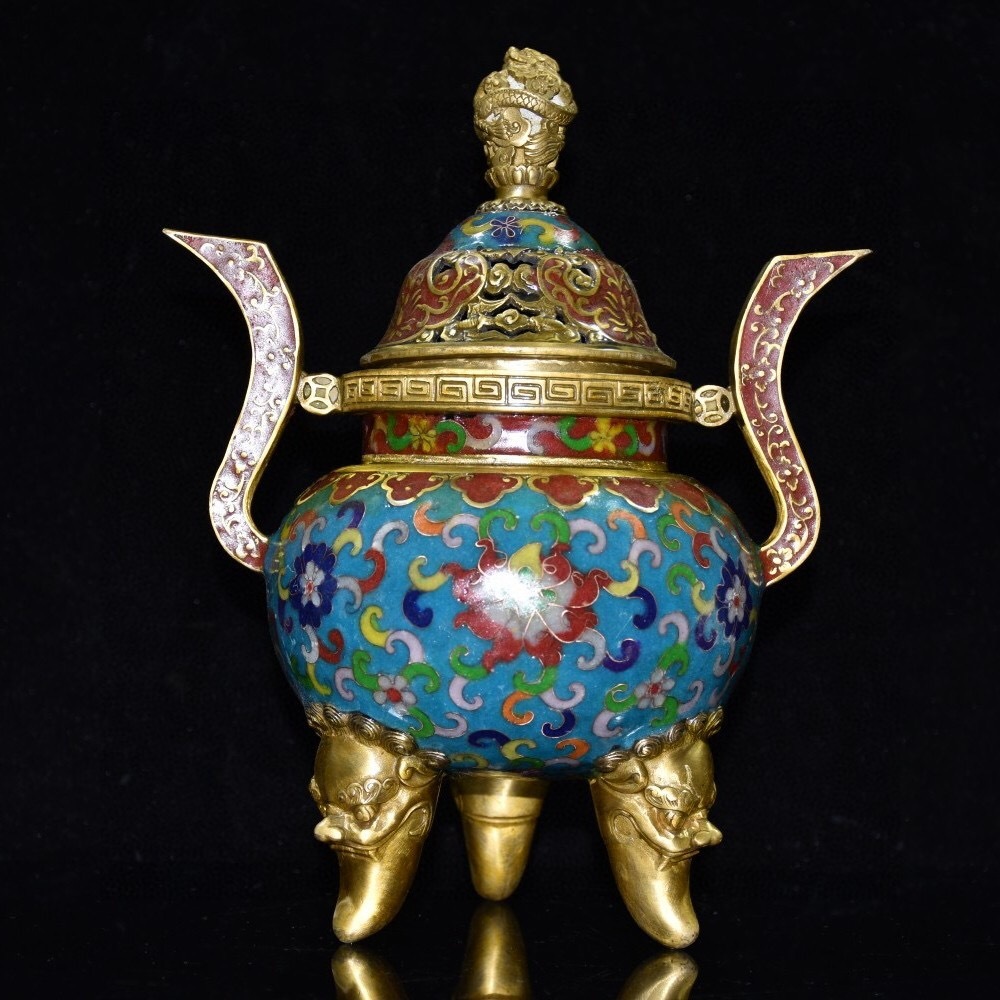 - ▽鴻▽ 銅製 景泰藍 琺瑯彩 塗金 雙耳 三足熏香炉 置物 賞物 古賞物 中国古玩 中国古美術