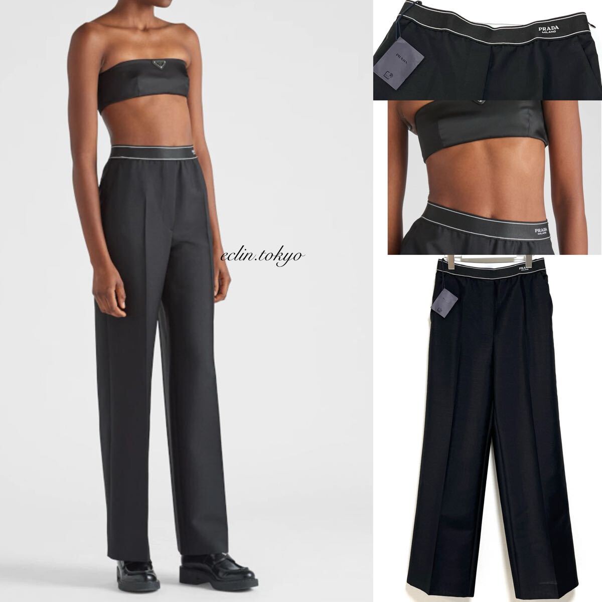 > 【E4594】未使用品!近年モデル 完売品 PRADA プラダ《ウエストロゴ入り》ワイド スラックス パンツ 黒 I40 履き心地抜群 リラックス仕様!