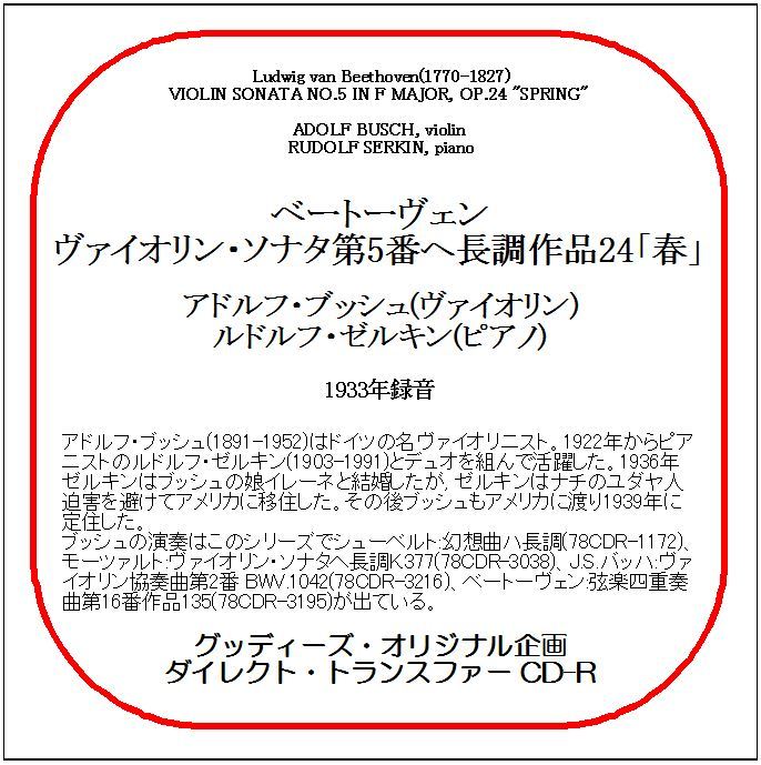 - ベートーヴェン:ヴァイオリン・ソナタ第5番「春」/アドルフ・ブッシュ/送料無料/ダイレクト・トランスファー CD-R
