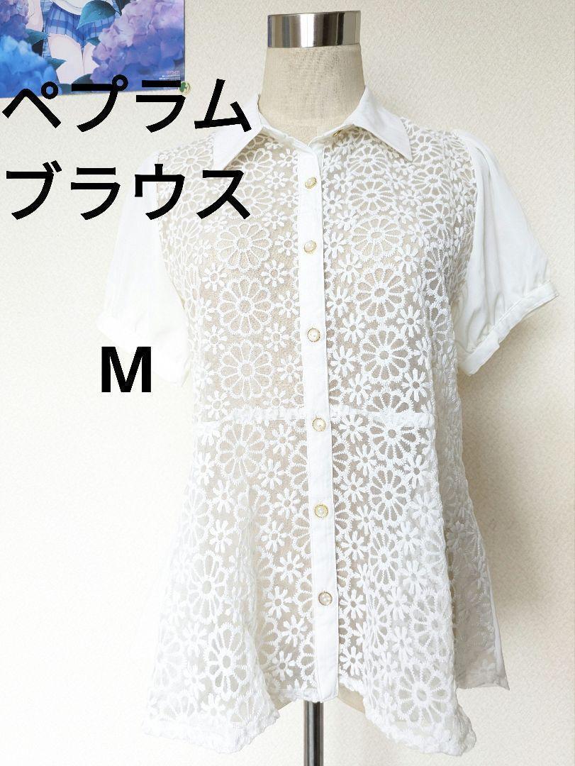 - 値下げ【美品】ペプラム ブラウス オフホワイト 白 M レース 清楚 可愛い