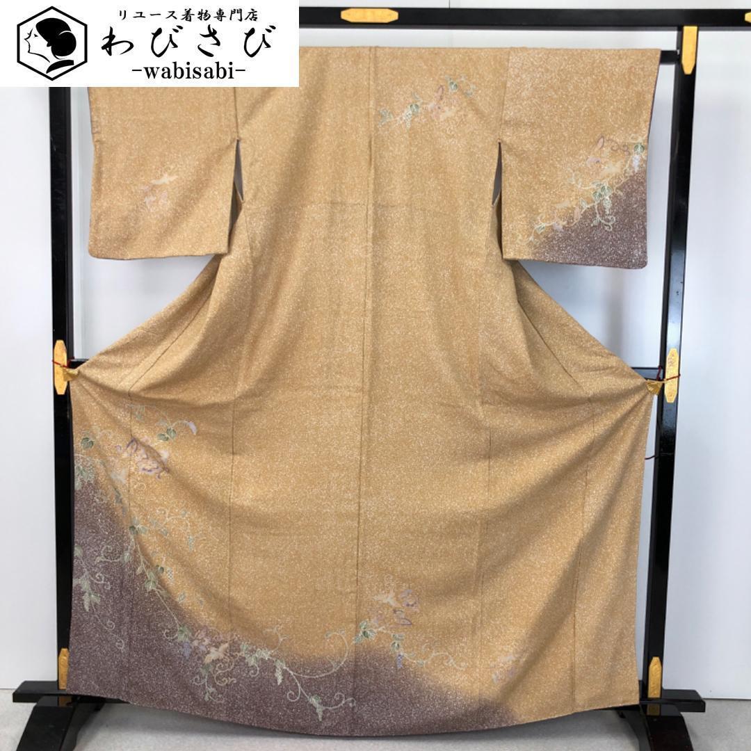 山吹鼠色ベースのお色味に暈し、叩き染、花喰い鳥に葡萄唐草の柄裄がデザインされた素敵なお品でございます。
