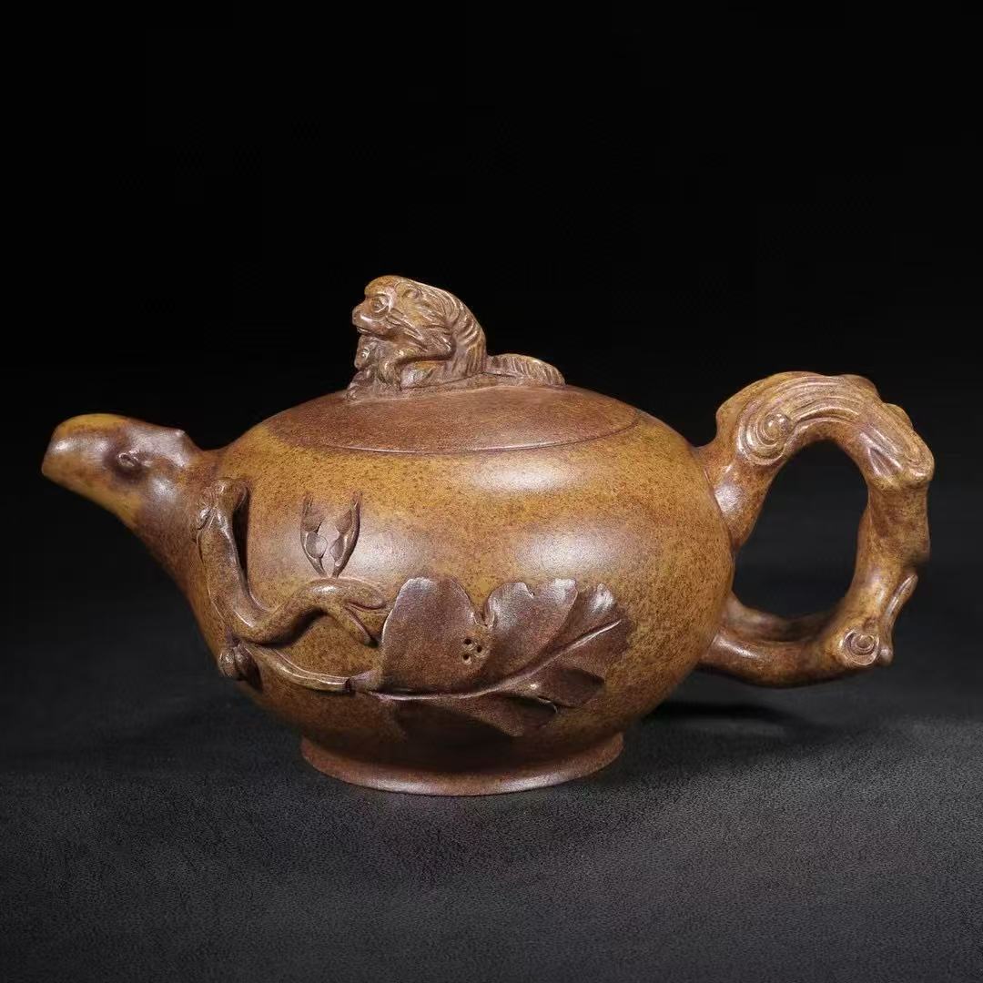 - 友人館蔵 古原鉱鍛泥製 母子情深壺 葉子紋 蓉款 茶壺 紫砂壺 急須 茶道具 煎茶道具 極細工 古美味 中国唐物 時代物 骨董 中国古美術