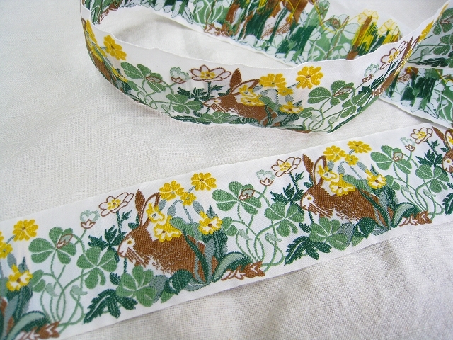 - ドイツ カフカリボン ジャガード織 リボンテープ うさぎ ホワイト地 幅50ミリ