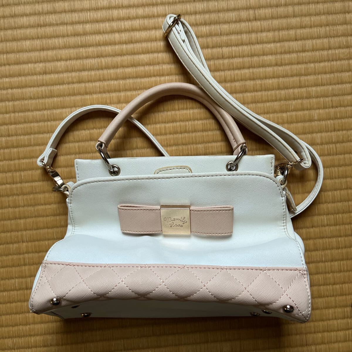 - ホワイトとピンクのコンビネーションで、リボン付きのキュートなデザインのハンドバッグ