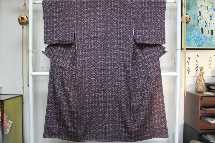 > きもの今昔8472 小紋のきもの 広衿袷仕立てシツケ糸付き未使用品 変わり織縦しぼの強い生地 濁り紫色 身丈145cm