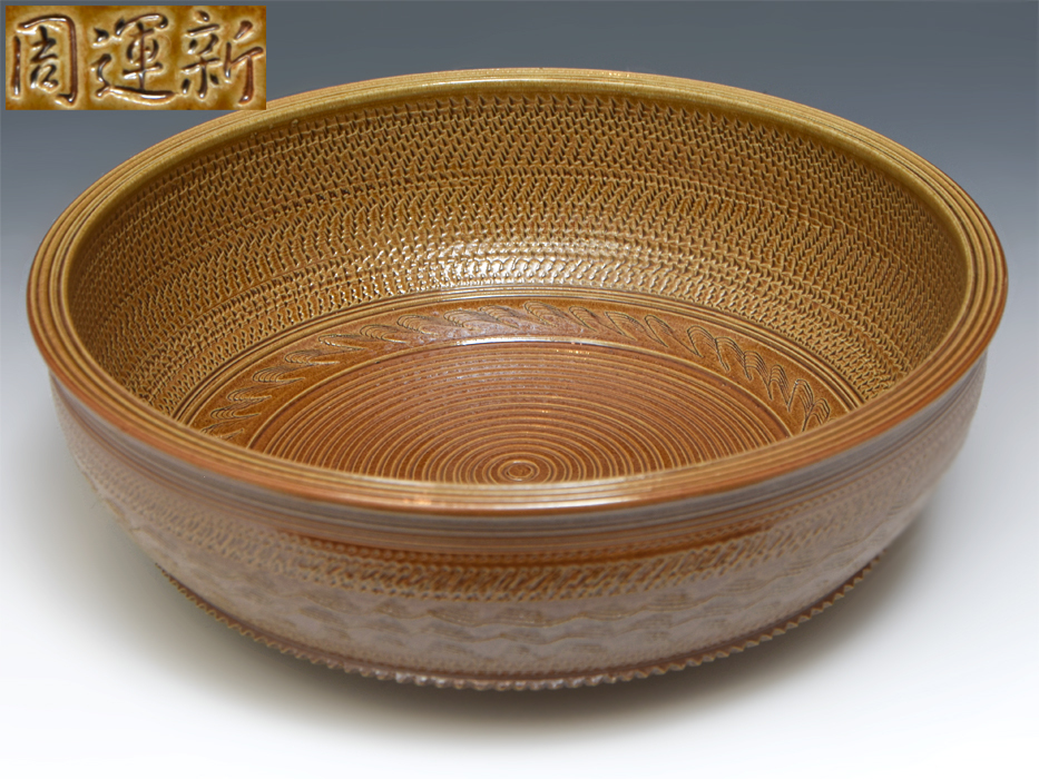 - 中国美術 新運園 在銘 褐釉 平鉢 専用箱 陶磁器 菓子鉢 茶道具 唐物 古玩 中国古玩 u0215a
