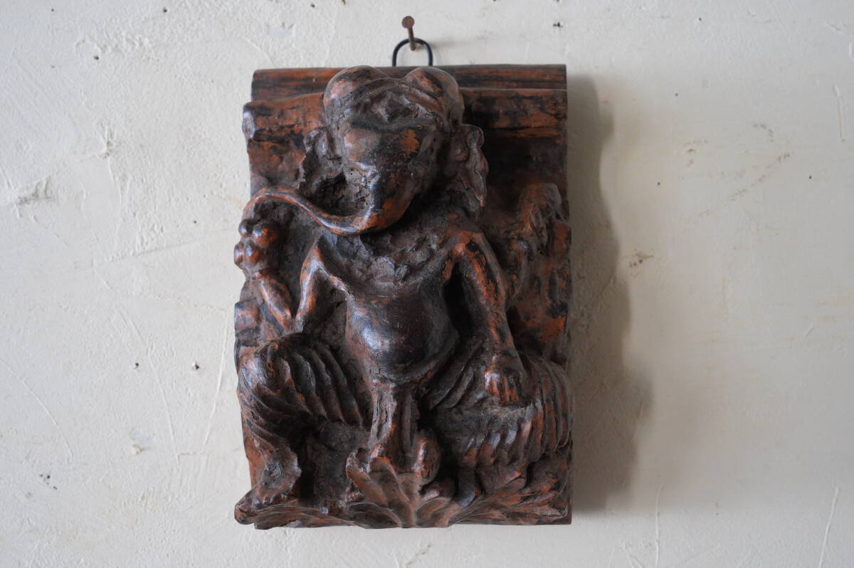 - インド アンティーク 木彫り 御守り オブジェ 壁掛け インテリア 古木 朽木 アート 古道具 神様 ヒンドゥー ガネーシャ ②