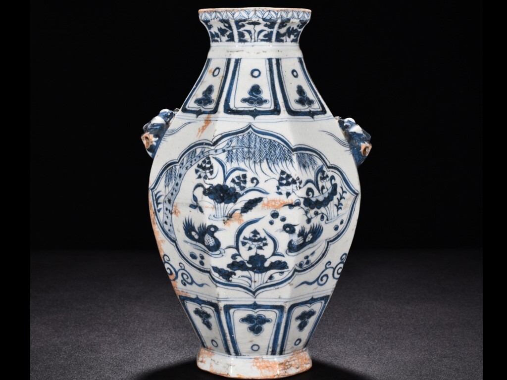 - TA331■中国古玩 唐物 元青花・蓮池鴛鴦紋八方獣耳罐・極細工 古賞物 ■高さ30cm・直径19cm■