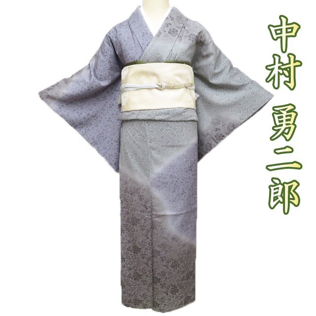 > 特選 訪問着 着物 中古 正絹 袷 人間国宝 中村勇二郎 落款 花模様 暈し 灰色 錫色 青白橡色 身丈159cm 裄62.5cm M きもの北條 A1190-7