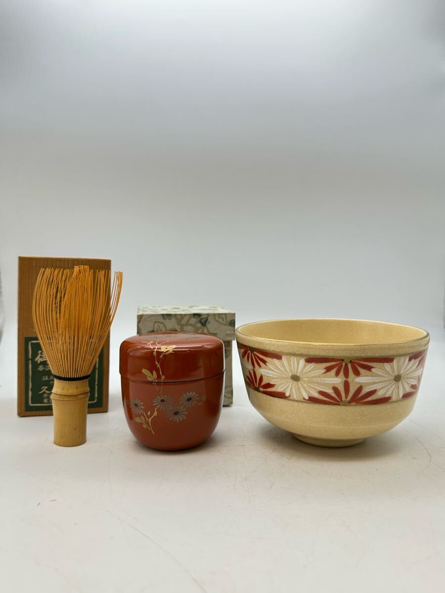 - Y05024 茶道具 抹茶碗 茶碗 茶筅 棗 赤塗 茶器 煎茶道具 3点まとめて