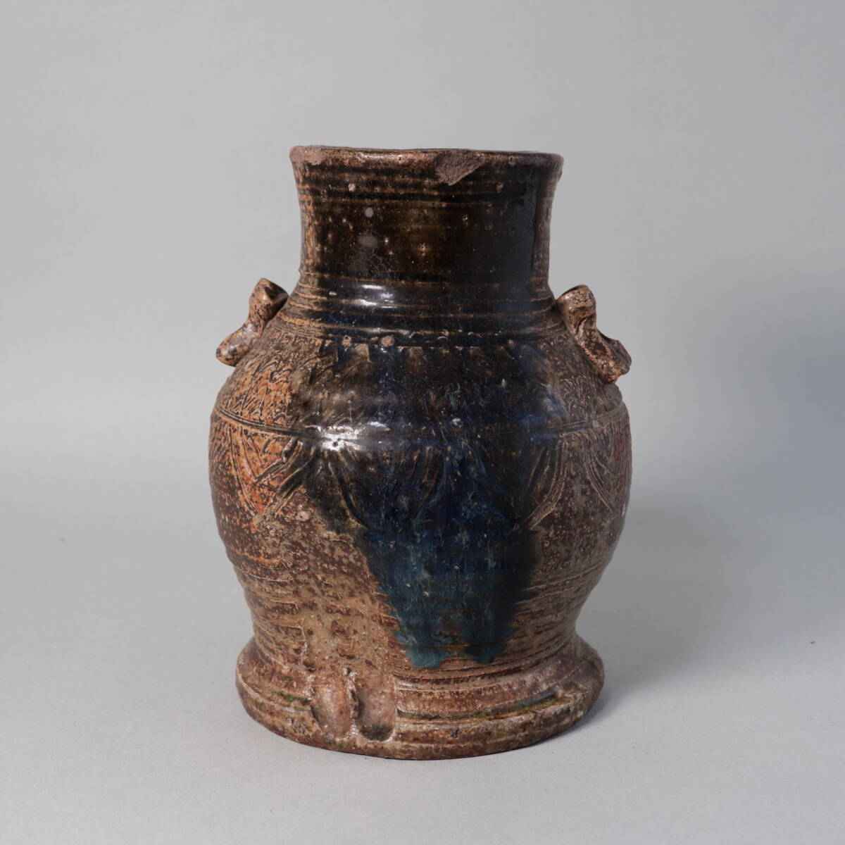 - 信楽焼 江戸時代の茶陶工【信開山】 海鼠釉 釉掛け 双耳壺 花瓶 古陶 骨董 民藝壺 花入 江戸時代 幕末 C5
