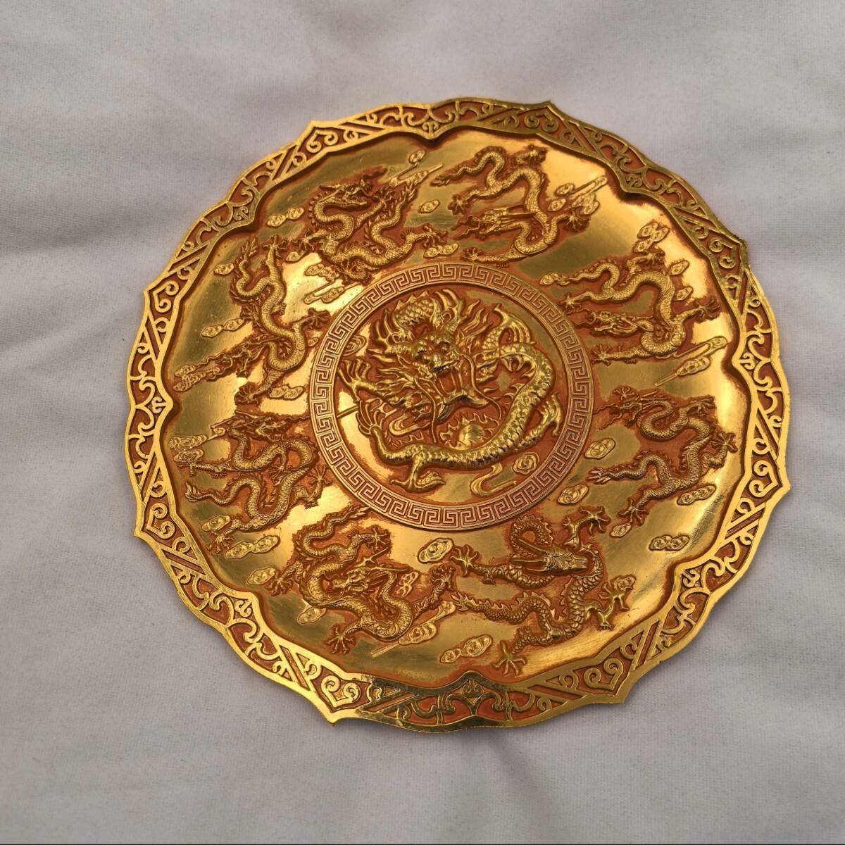 - 蔵友旧蔵出 銅製 塗金 九龍紋 供盤 置物 古賞物 中国古玩 中国古美術品