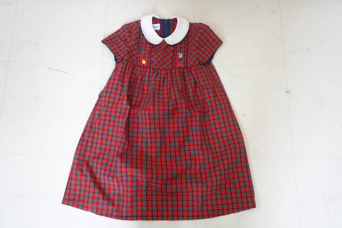 > 美品 ファミリア 半袖ワンピース 定番 チェック柄 フルーツ刺繍 110 送料185円(150)