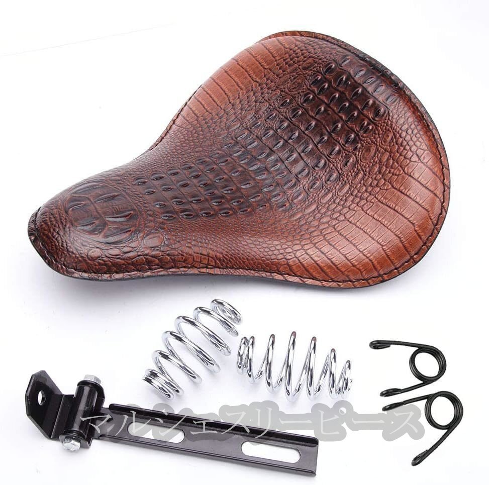 - バイク汎用ソロシート (ワニ革レザーブラウン) 衝撃吸収 スプリング、ブラケット付き