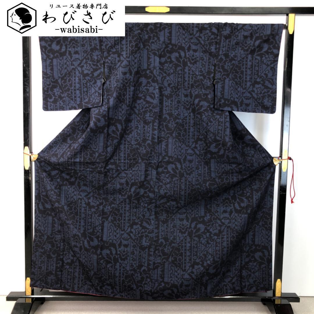 > 本場真綿結城紬 80亀甲 花唐草模様 証紙付 濃紺色 K-4734 着物 きもの kimono 和服 和装 中古 リサイクル着物 【送料無料】
