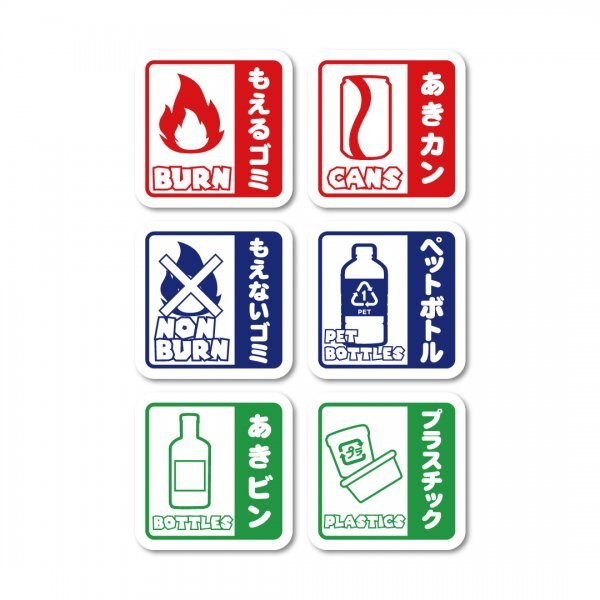 - ゴミ 分別 3色ステッカー 6枚セット 小 W50mmxH50mm マットラミ 【新品即決】 ゴミ箱 シール 屋外使用OK 燃えるごみ 燃えないごみ 缶 ビン