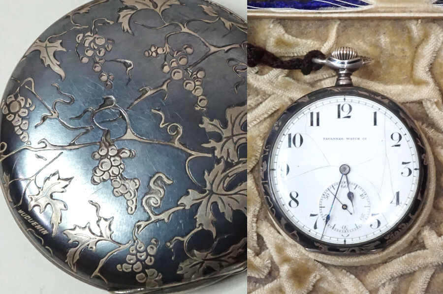 > 銀刻印 懐中時計D ニエロ象嵌 葡萄紋 TAVANNES WATCH Co タバンウォッチ 在銘 スモセコ ビンテージ アンティーク 昭和レトロ