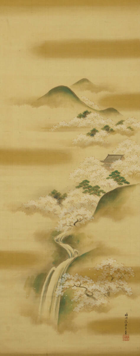 - 【真作】掛軸「狩野晴川院 桜花山水図」絵画 江戸後期 狩野派 木挽町狩野家九代 江戸幕府奥絵師 山水画