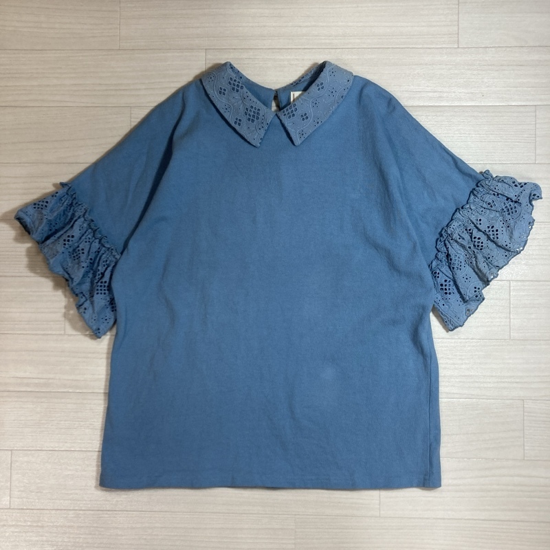 > poppy tokyo/ポピートーキョー/コットンレースドッキングシャツ/襟・袖 レース フレアスリーブ ブラウス/ブルー/半袖/ゆったりシルエット
