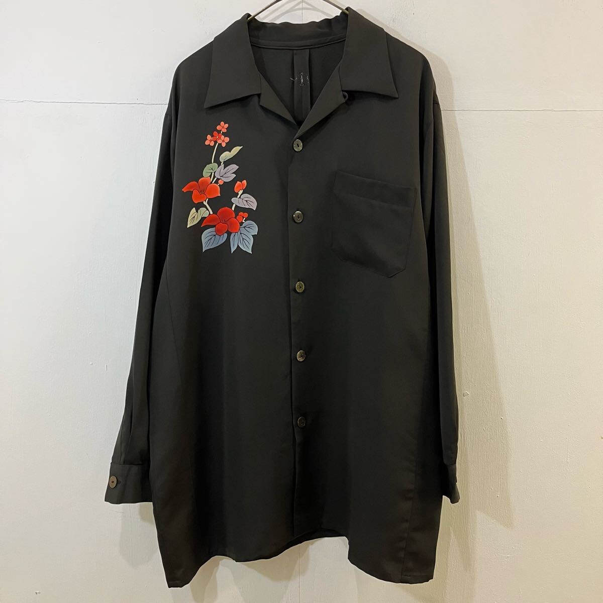 - 着物リメイク? 和柄 和物 開襟シャツ オープンカラーシャツ 花柄 長袖シャツ レトロ VINTAGE 黒 ブラック【レターパックプラス郵送可】F