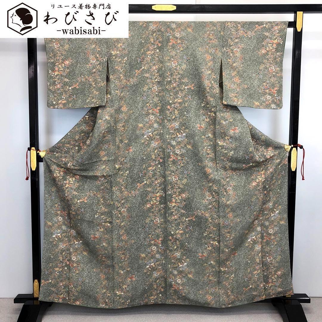 > 小紋 花唐草模様に鳥 叩き染 縮緬 利休鼠色 K-3482 着物 きもの kimono 和服 和装 中古 リサイクル着物 【送料無料】