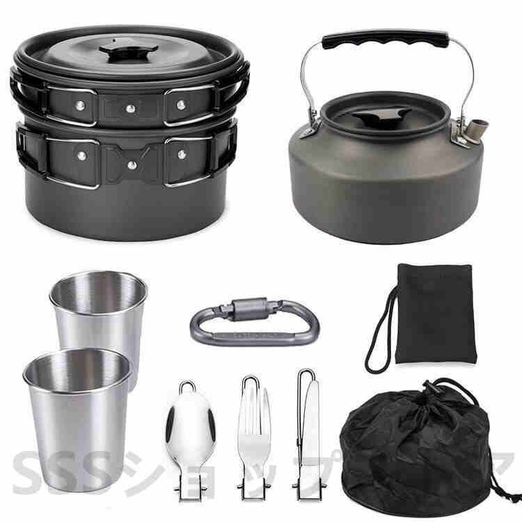 - アウトドア 鍋 クッカーセット 調理器具 アルミニウム 軽量 鍋 ケトル キャンピング 10点セット 2~3人用 収納袋付き