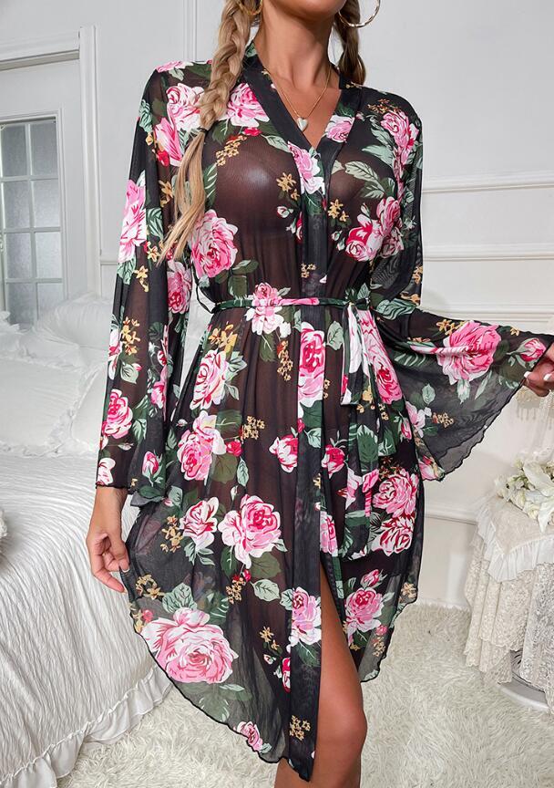 - DM0521 レディースナイトウエア☆ 大人sexy☆ 部屋着 可愛い 花柄 プリント ガウン シフォン