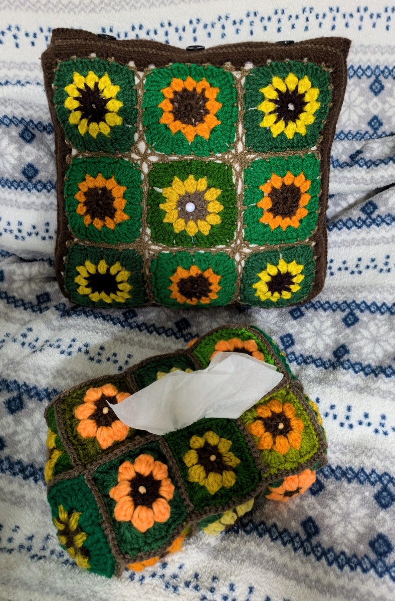 > グラニースクエア♪2品セット■クッション&ティッシュカバー■花モチーフ黄橙緑茶・ポップ■レトロ■グラニー編■クッション新品■手作り