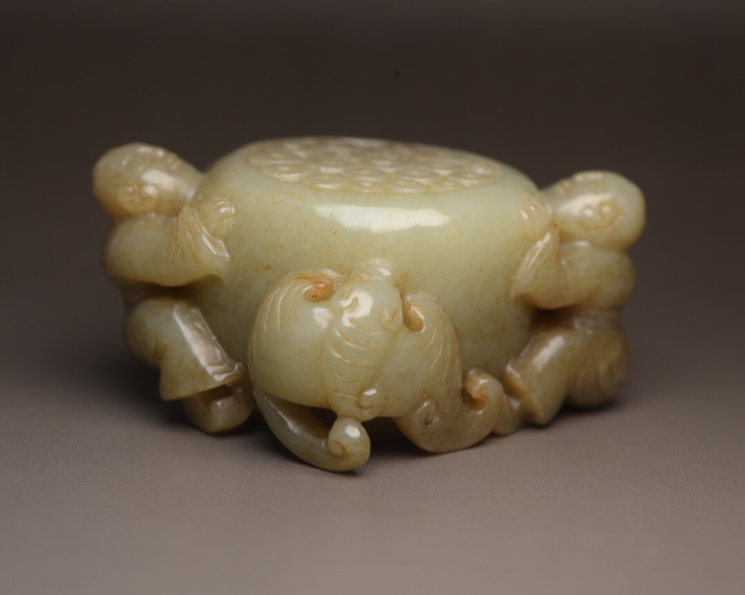 - 【超珍館蔵】和田玉製 細密彫 童子戲蓮 置物 賞物 古賞物 古董品 古美術品 時代物 旧家蔵出 稀少珍蔵品