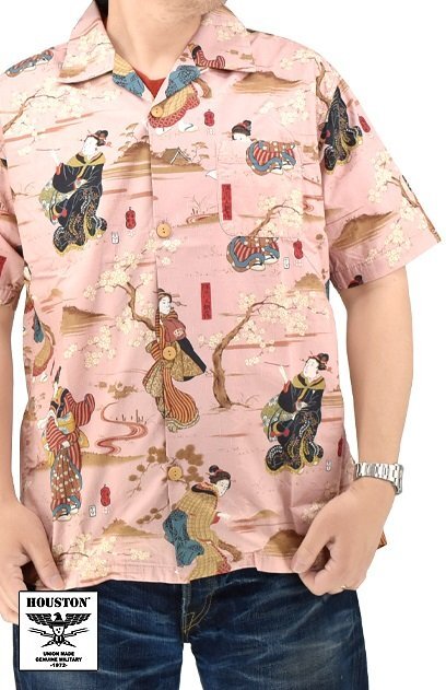 - 日本製コットンレーヨンアロハシャツ「歌川国芳・隅田川之朝霧」◆HOUSTON ピンク Lサイズ 41169 ヒューストン 和柄 ハワイアン 国産